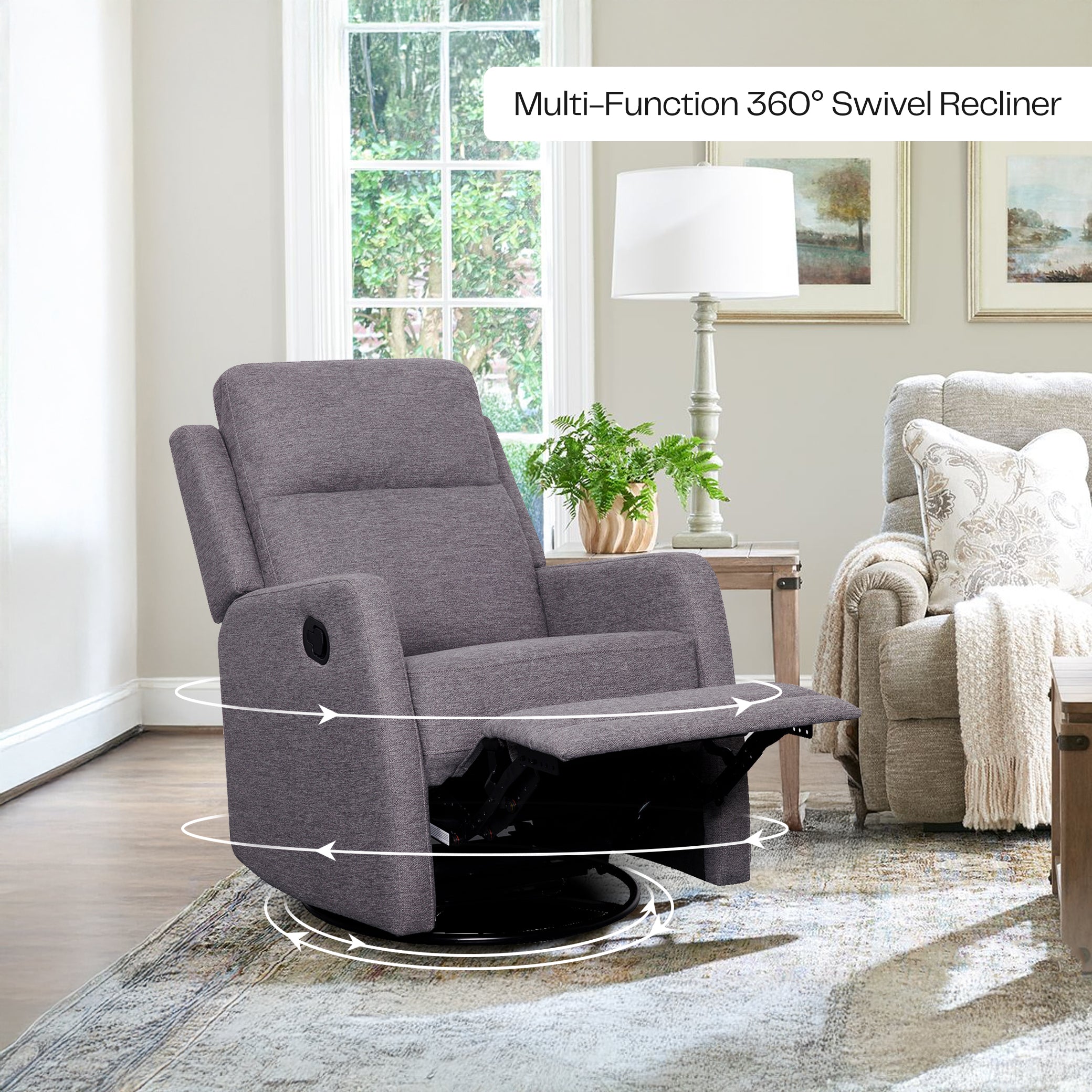 The Diana Recliner (SY-RC030) in grey VRRH265-04 fabric is a practical choice for everyday relaxation. With its smooth manual recline, calming glider motion, and 360° swivel base, it's perfect for nurseries, reading nooks, or any spot that needs a cozy upgrade.
