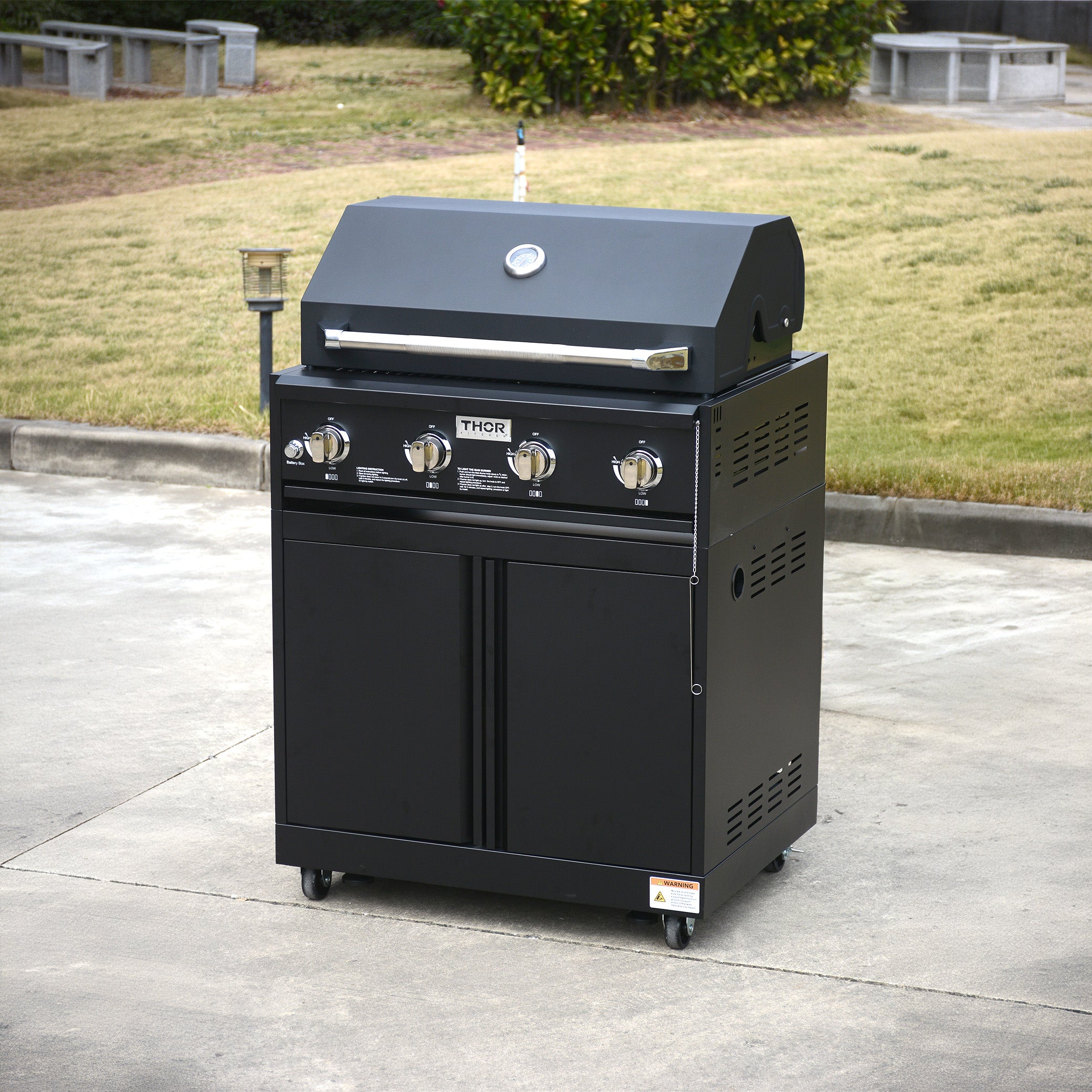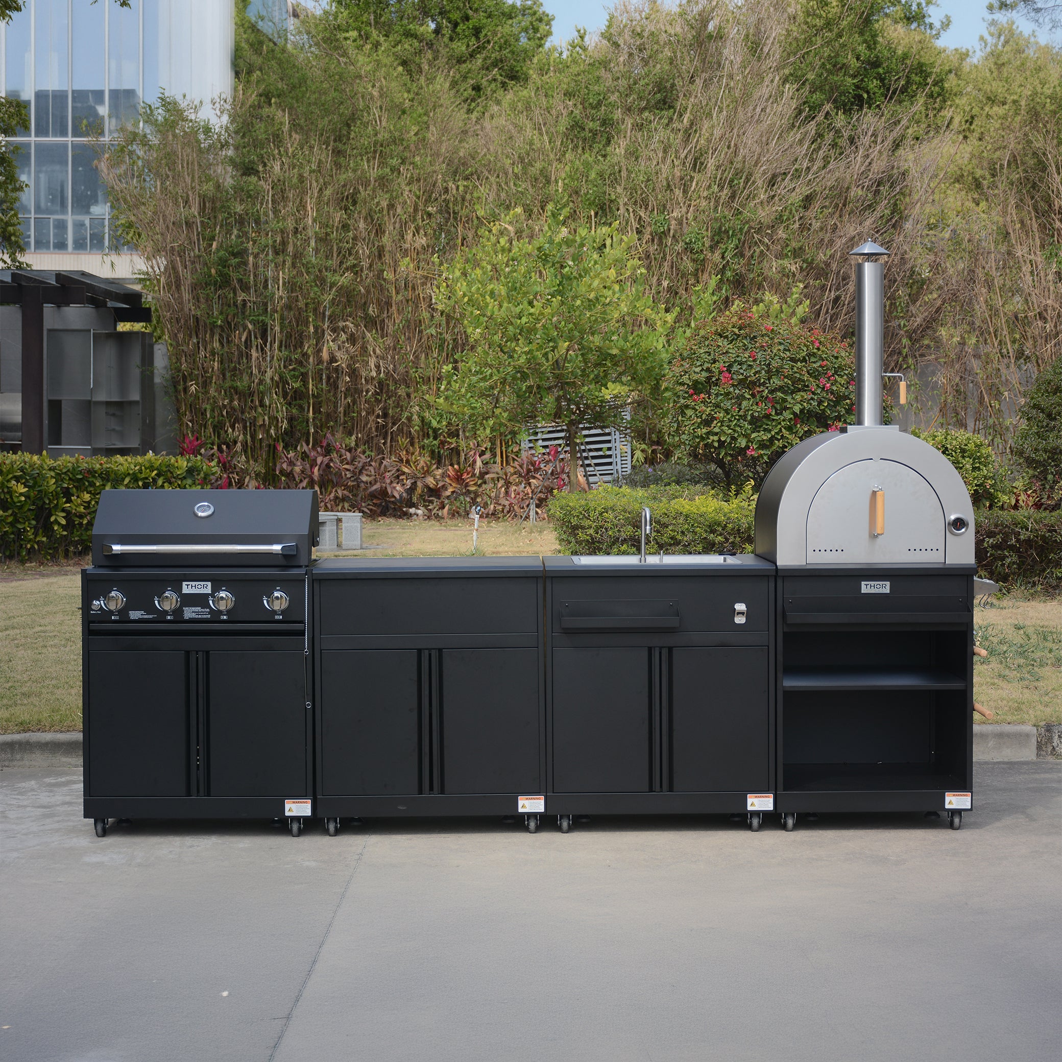 The Thor 4-Piece Modular Outdoor Kitchen Island is in matte black with black nickel accents and features heavy-duty construction. Features include a 30-inch 5-Burner Grill with Cart in Black Satin Finish, LP (NG could be converted), a 32-inch Cold Water Sink with Foldable Faucet in Black Satin Finish, 32-inch Utility Cabinet with Storage Shelf in Black Satin Finish, Wood Fire Pizza Oven in Black Satin Finish with Double Wall Insulated Oven Door, with Weather Cover for Pizza Oven, Sink and Utility Cabinet.
