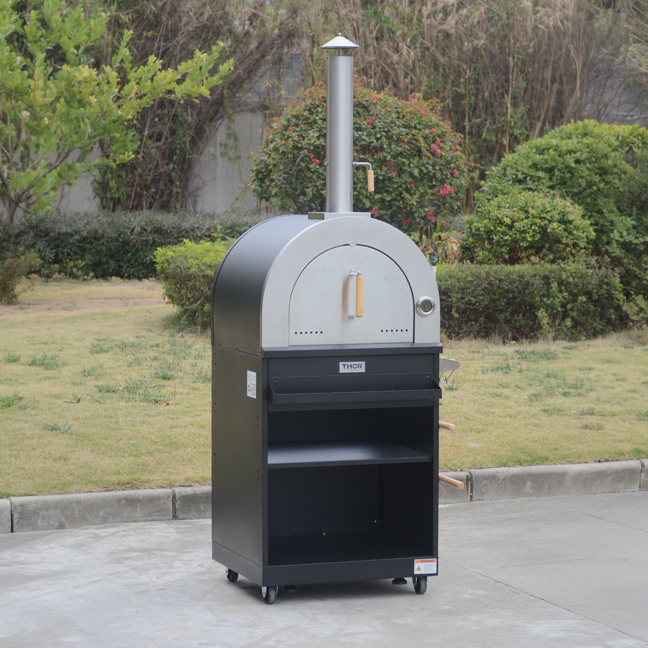 The Thor kitchen moveable wood burning pizza oven offers the power and performance of a premium pro-style pizza oven at a practical price. It adds smoky and savory flavor to any recipe, and features a generous cooking area of 500 sq. in and a durable 20mm cordierite pizza stone. Its 4 Burner Grill offers 4 stainless steel 10000BTU main burners, allowing you to rotate meats and sear in the juices. A push-and-turn ignition system makes starting this griddle easy and lets you make precise temperature adjustments with brilliant blue LED knob lights. The four stainless steel burners heat the cooking surface quickly with up to 40,000 BTU of even heat. The sink with foldable faucet and service cart offer the versatility to prepare a multi-course meal at the same time, with inside layer shelves adding storage.